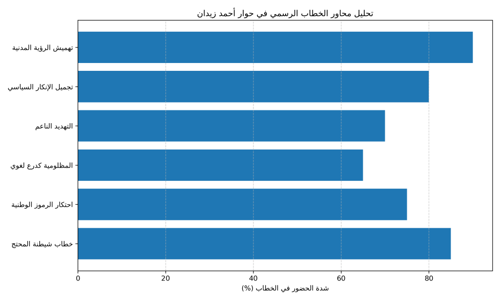 - يكشف تحليل خطاب زيدان عن تصور لدولة تسعى إلى صيانة صورتها لا عبر الحلول، بل عبر التجميل البلاغي للأزمات، فالمعاناة تُرفع إلى مستوى الرمز، بينما تبقى الجراح السياسية والاجتماعية معلّقة في فضاء المجاز، لا تُعالَج بل تُؤجَّل، وهذا الخطاب يجرد الساحة من أي تصور مدني حقيقي يعيد بناء الثقة بين الدولة والمجتمع على أساس المؤسسات والمساءلة، ويكتفي بلغة أبويّة مفرغة من أدوات الفعل.