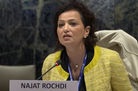 بدأت رشدي خطابها بمرجع رمزي لافت عن مرور خمسة وعشرين عاما على قرار مجلس الأمن 1325 بشأن المرأة والسلام والأمن، وكان ذلك أكثر من استحضار بروتوكولي؛ رسالة ضمنية تقول إن المرأة التي دفعت ثمن الحرب، لم تُعطَ بعد نصيبها من السلام.