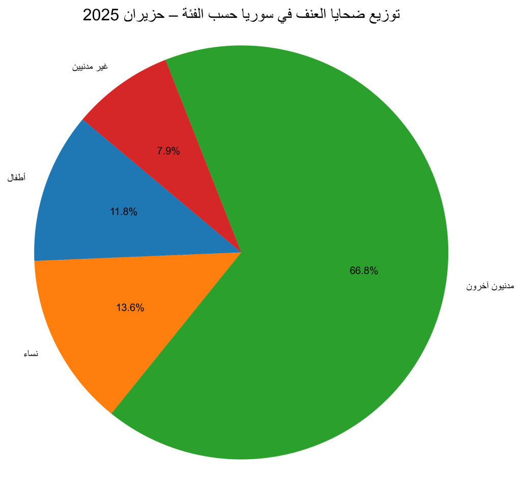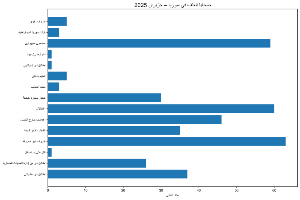 المرصد السوري لحقوق الإنسان سجّل 360 قتيلا من المدنيين، وهنا لا يرتبط الأمر بضحايا صدام عسكري مباشر، بل خليط مرعب من الاغتيالات، والإعدامات، والتفجيرات، والكمائن، والألغام، وحتى التعذيب في السجون، فأن يُقتل طفل بلغم قديم في ريف مهمل هو وجه آخر لنفس العملة التي يُقتل بها ناشط برصاص مجهول وسط مدينة.